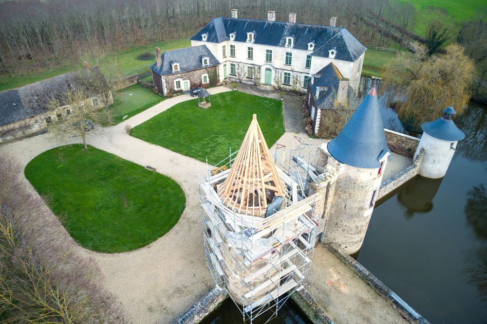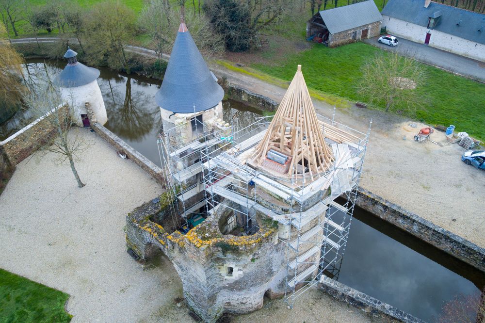 Ces travaux n'étant pas suffisant, nous avons décidé en 2022 de refaire la toiture des tours et de l'escalier avec l'accord des Bâtiments de France et les recherches effectuées par le cabinet Terrien Architectes.