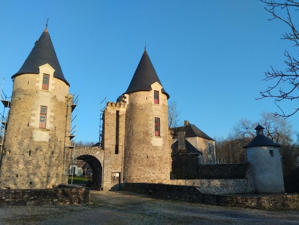 En 2025 nous commençons le dernier label afin de restaurer la totalité de l’escalier en vis, alliant ardoise et tuffeaux, afin de pouvoir monter jusqu’au dernier étage. L’objectif étant d’ouvrir à la visite l’ensemble du châtelet et d’y exposer notre atelier de fausse monnaye. Cet escalier sera terminé par une terrasse invisible portée par une enrayure recouverte d’un plafond en planche de chênes, protégé par une membrane recevant l’eau de pluie et la déversant dans les douves par un lancier. Nous referont les encadrement des portes et des fenêtres et poseront des nouvelles portes et des fenêtres avec des vitraux.