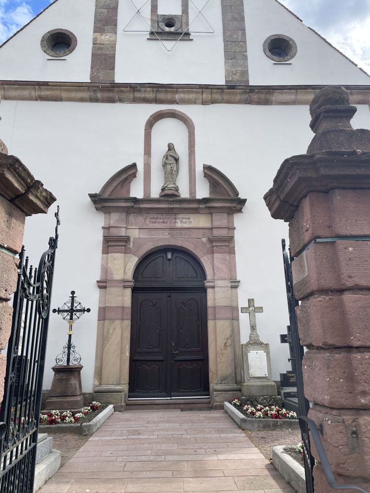 A l’origine du nom du village, « l’église dans les champs » est le berceau du village. Dès 786, une petite communauté paysanne s’était installée autour de ce sanctuaire rural, édifié avec des pierres de grès des Vosges que les habitants étaient allés chercher eux-mêmes. En 1725, le seigneur Conrad von Rosen fit bâtir l’église actuelle, comme l’atteste une inscription gravée sur le portail. Le dernier étage du clocher et la flèche furent ajoutés en 1870. Longtemps unique lieu de culte pour les communes voisines – Feldkirch, Ungersheim, Pulversheim, Bollwiller et Raedersheim –, elle s’est développée en devenant un important lieu de pèlerinage à saint Fridolin, invoqué pour la guérison des enfants et du bétail. L’église conserve aujourd’hui la crypte funéraire des descendants du comte von Rosen et demeure le symbole du lien profond entre les habitants et leur histoire.