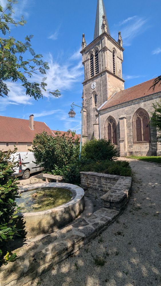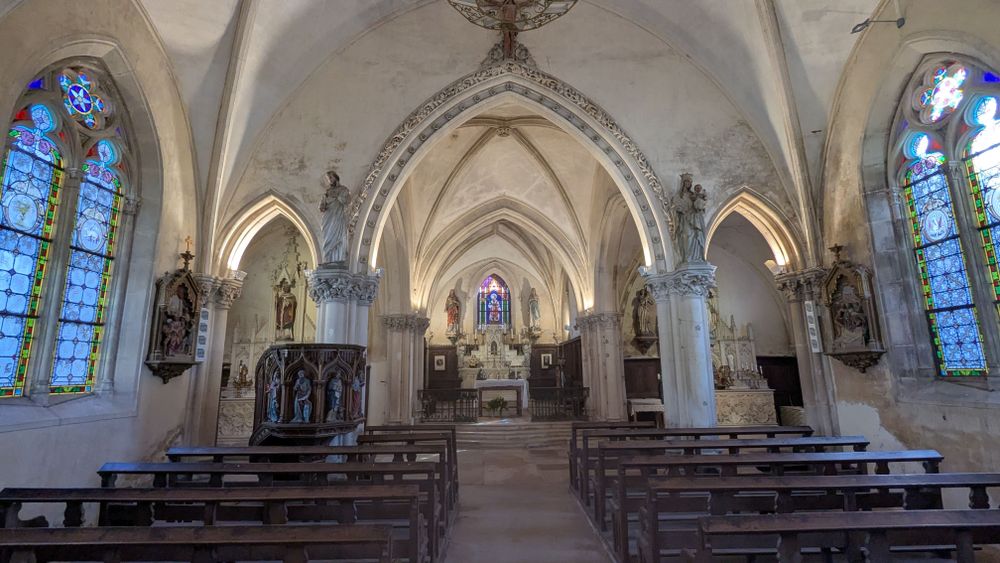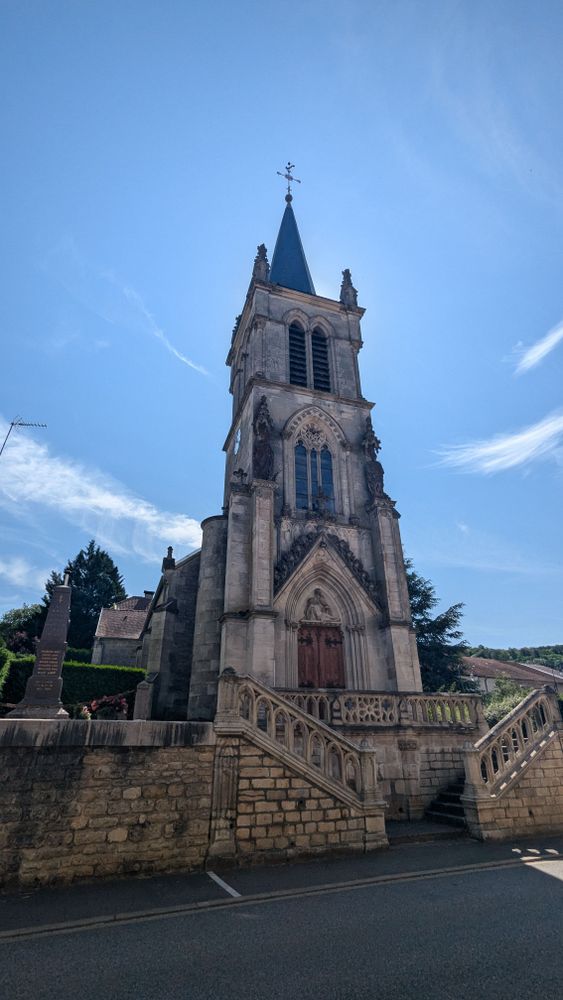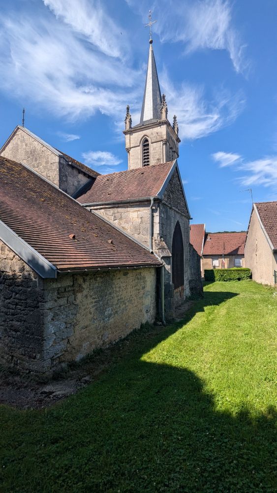 Édifiée dès le XIIe siècle, l’église actuelle conserve des traces de ses origines médiévales, visibles dans des éléments de décor en réemploi. Agrandie et transformée au fil du temps, elle connaît d’importantes campagnes de reconstruction au XVIe siècle, puis au XVIIe siècle avec l’édification de la nef. Après un grave incendie en 1870, la nef et la tour-clocher sont à nouveau rebâties par l’entrepreneur Émile Corroy de Liffol-le-Grand. L’ensemble forme aujourd’hui un édifice homogène, marqué par son clocher orné de deux statues en fonte et par son chœur éclairé de beaux vitraux du XIXe siècle. Ouverte au culte et accessible au public, l’église occupe une place centrale dans la vie du village. Bien que non protégée au titre des Monuments historiques, elle abrite une Pietà en pierre classée, témoignage de son intérêt patrimonial.