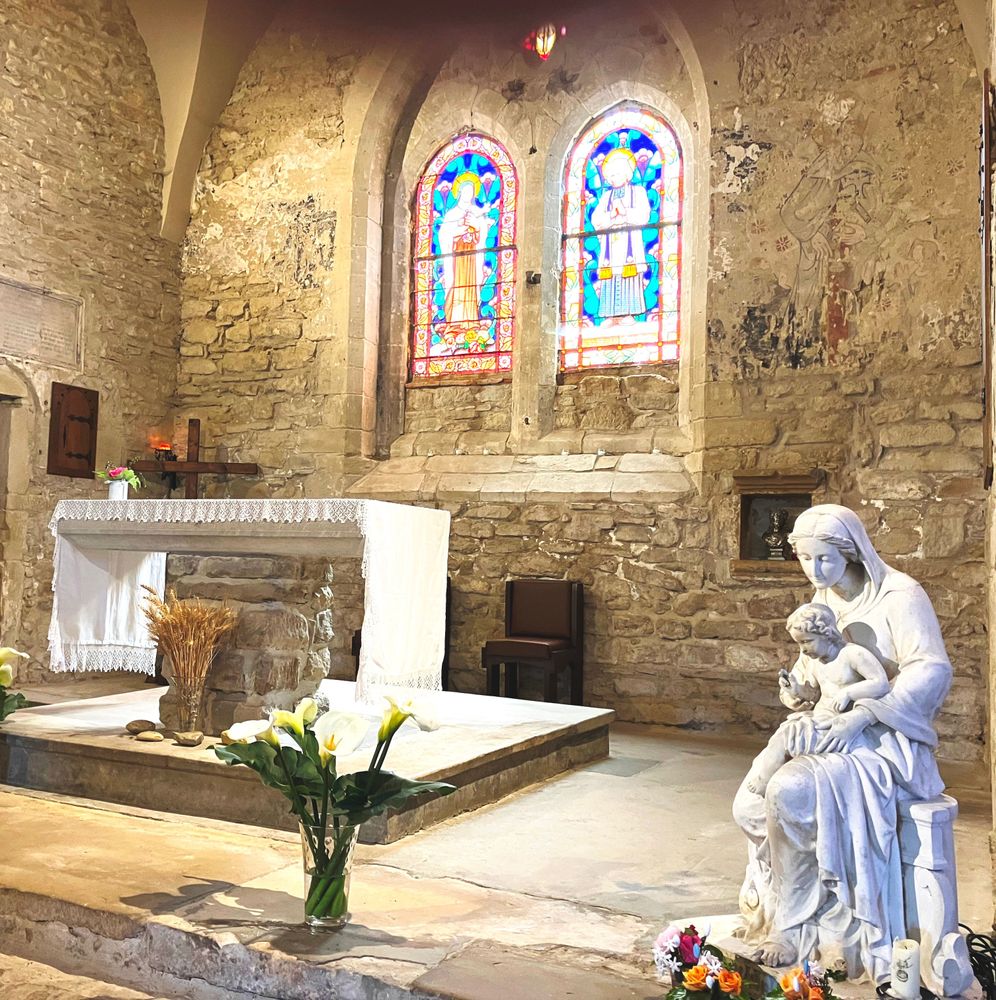 Les vitraux de style médiéval datent de 1929 et représentent deux personnages canonisés ensemble en 1925 : Sainte Thérèse de Lisieux et le Saint Curé d’Ars.