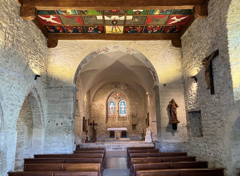 L’église de style roman a été construite à partir du XIème siècle. Des éléments du bâtiment sont classés au titre des Monuments historiques depuis 1958. Plusieurs sculptures en bois datant du 18ème siècle sont classées au titre des objets du patrimoine historique depuis 1986. Une plaque commémorative du 16ème siècle bénéficie elle aussi de cette protection (1934). Le plafond de la nef de l’église est constitué de 70 caissons peints et enluminés représentant une création sobre et symbolique de la vie biblique. Cette œuvre remarquable a été réalisé par l’artiste Jacques Bernard en 1982. Dans le transept droit on peut admirer un superbe vitrail réalisé par un maitre verrier en 1983.