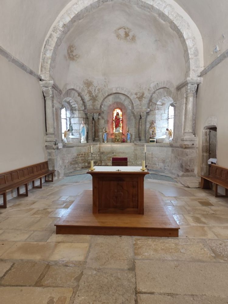 La restauration de l’abside vise d’abord à refaire le toit en lauzes à l’identique, en réemployant les pierres existantes chaque fois que cela sera possible, bien que certaines soient cassées ou en mauvais état. Au niveau de la façade, les mousses et la végétation seront éliminées, car elles favorisent les infiltrations d’eau. Les joints entre les pierres seront repris avec un matériau à base de chaux. Les vitraux seront également restaurés et leur étanchéité à la base sera améliorée. Une colonnette en molasse, aujourd’hui érodée et insuffisante pour soutenir l’arc de l’ouverture, sera remplacée. L’écoulement des eaux de pluie sera revu. Actuellement, celles-ci sont collectées dans une cunette circulaire en galets maçonnés qui entoure la base de l’abside, mais ce dispositif ne permet pas une évacuation suffisamment rapide, ce qui entraîne des remontées d’humidité au pied de l’édifice. Le toit de l’arrière-chœur, couvert de tuiles écailles, fera également l’objet d’une révision, notamment par un démoussage. Enfin, les enduits intérieurs de l’abside et de l’arrière-chœur, dégradés par l’humidité, seront déposés en lien avec les services archéologiques de la DRAC, puis refaits avec un enduit plus adapté.