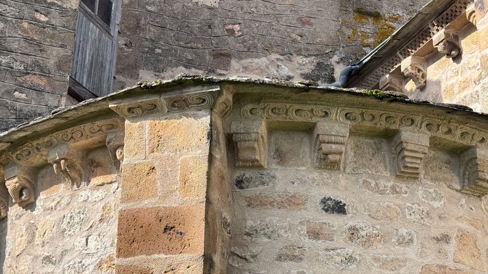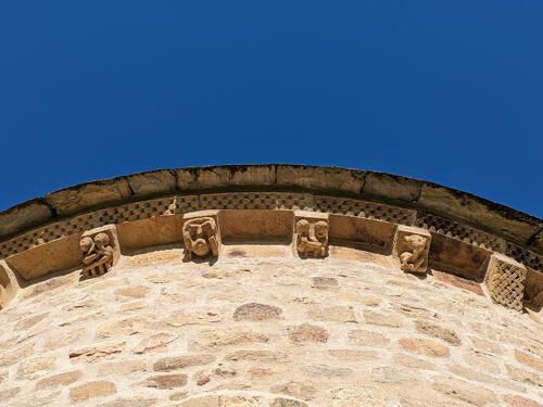 Les modillons sculptés, typiques de l’art roman, sont parmi les trésors les plus fascinants de l’église. Situés sous les corniches du chevet et de l’absidiole sud, ils reprennent le style des maîtres sculpteurs de La Chaise-Dieu. Représentant des animaux, des personnages ou des scènes parfois humoristiques ou morales (comme le « tireur de barbe » ou les « jumeaux »), ces sculptures ont souvent une portée symbolique. Une représentation marquante est celle d’une femme aux serpents, évoquant le châtiment de la luxure.