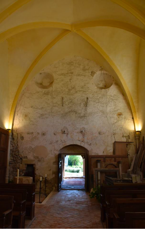 Ce troisième projet vise à poursuivre la restauration : reconstruction des contreforts, indispensables pour consolider le flanc sud de la nef, très fragilisé ; réfection d’un fenestrage, au-dessus de la chaire, où un nouveau vitrail pourrait être installé ; restauration intégrale du narthex (sols et murs) et du mur occidental de la nef, en respectant les peintures et blasons très anciens qui l’ornent de part et d’autre.