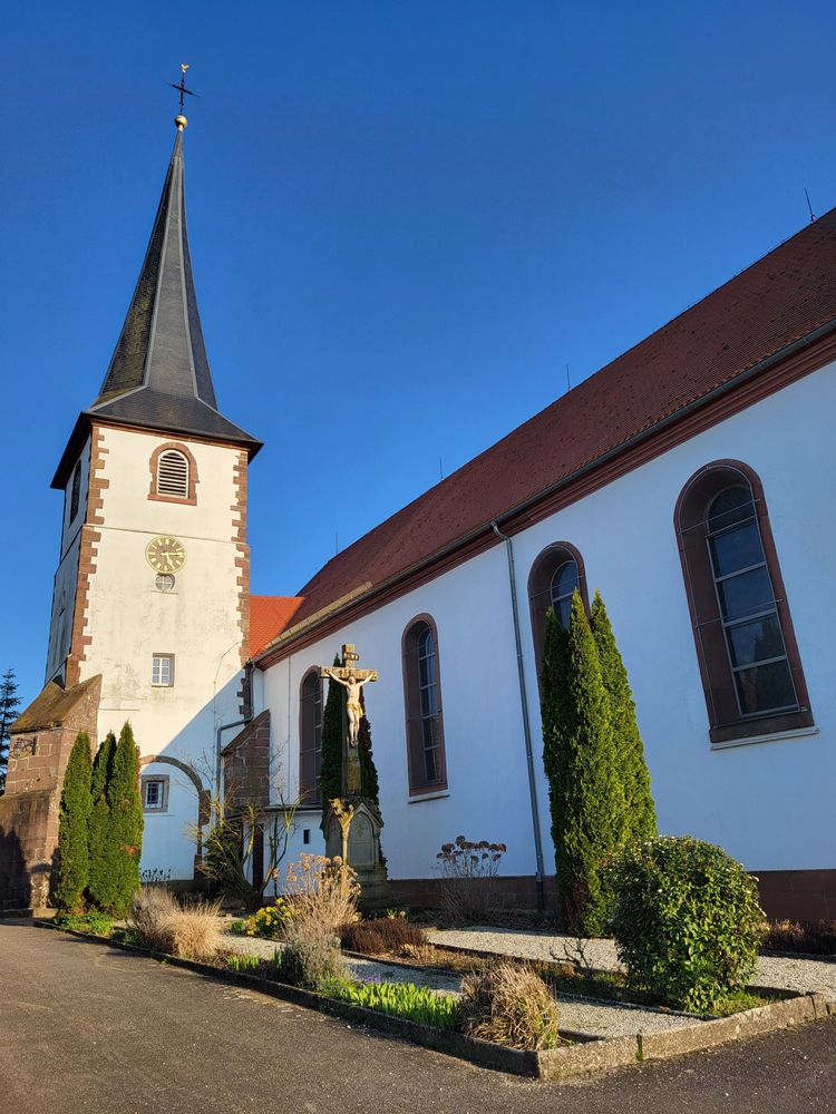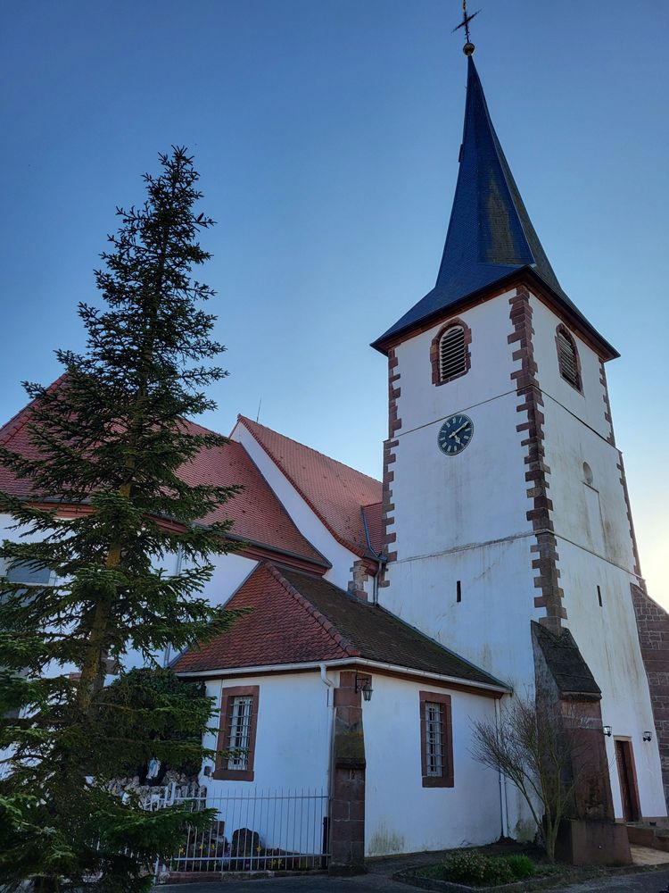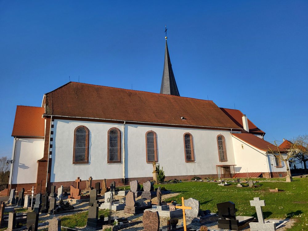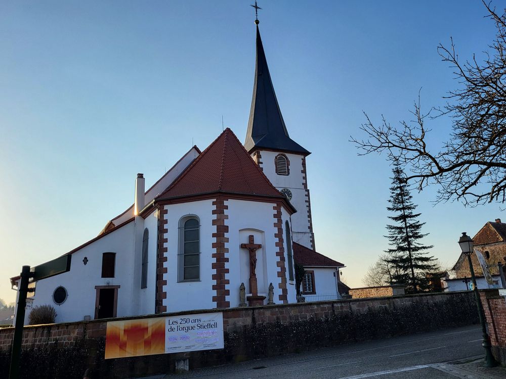 La tour-clocher correspond vraisemblablement à une ancienne tour-chœur qui a probablement été reconstruite en 1628, date encore visible sur l’ancien arc triomphal. Cette tour-clocher devait abriter le chœur tandis que la nef s’étendait dans son prolongement, sur l’actuel karichhoft.