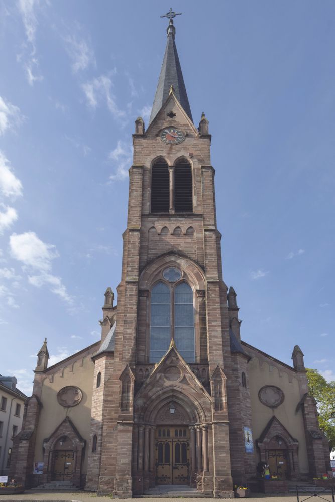 Aujourd’hui c’est un édifice néo-gothique en grès rose qui se distingue par sa nef à bas-côtés, son transept saillant et son chœur polygonal, le tout couvert de voûtes d’ogives et d’arcs brisés. L’édifice conserve également un abat-son en forme de flèche ajourée, élément rare de son architecture.