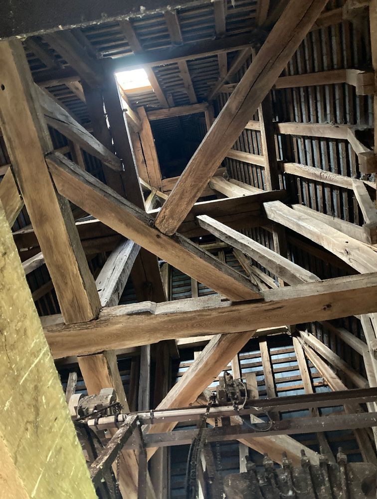 La phase opérationnelle actuelle porte sur la rénovation des toitures du chœur et de la nef, le traitement curatif et préventif des charpentes, la reprise de la zinguerie, le nettoyage complet des combles infestés par les fientes et dépôts de volatiles, ainsi que la pose de grillages rigides aux ouvertures du clocher pour empêcher toute intrusion. Ces travaux sont indispensables pour garantir l’étanchéité, la salubrité et la sécurité du bâtiment, préalable à son ouverture élargie au public.
