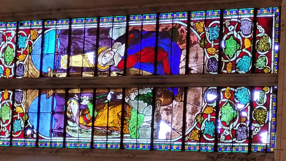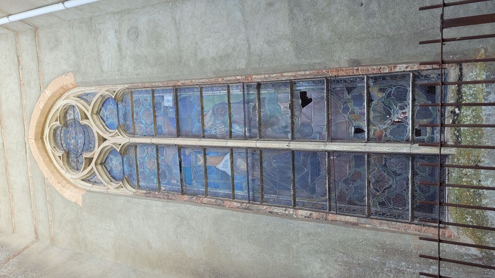 Plusieurs vitraux ont subi les affres du temps et du vandalisme. Deux d'entre eux ont déjà été restaurés, il reste ce magnifique vitrail en péril aujourd'hui : la Vierge Marie et l'Enfant à sauver.