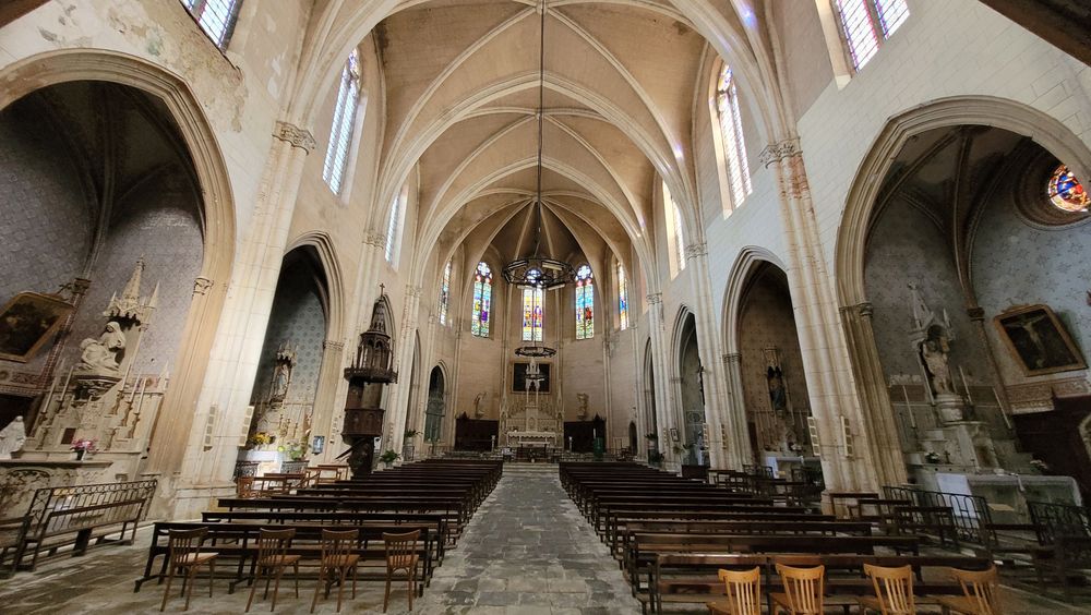 Bâtie en briques comme le clocher-mur, l'église de 1162 ne dépassait pas la largeur de celui-ci. Jugée insuffisante, elle fut agrandie un siècle et demi plus tard, à partir de 1312. A cet effet, on entailla la base du "pech" couronné par le château fort. Dans l'échancrure, fut enchâssée la nouvelle église avec ses dix chapelles latérales. Vers la fin du XVe siècle, une onzième chapelle fut édifiée dans le choeur droit du chevet : la chapelle de mise au tombeau.