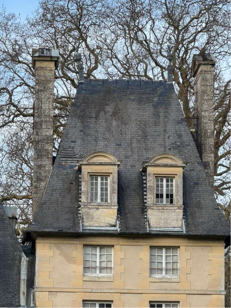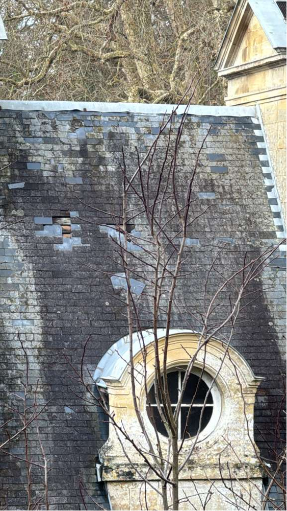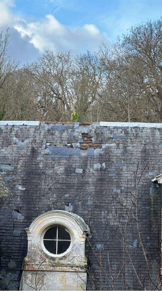 Les tempêtes successives et dernièrement la tempête Goretti ont gravement endommagé les toitures. Faîtages, arrachés, panneaux entiers d’ardoises arrachées. (Une mise à neuf des toitures a été prévue avec la DRAC à partir de 2027)