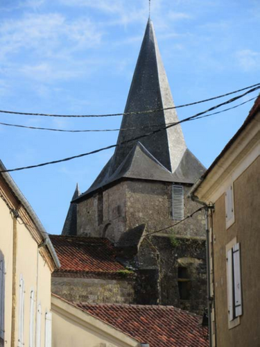 Le clocher-tour composite, puissamment contreforté et fortifié, forme un porche au-devant du portail d'entrée. Il est surmonté de deux étages, dont une chambre des cloches, et d'une élégante flèche à quatre pentes en ardoise. Celui-ci date de la fin du XVème siècle, comme le voûtement de la nef et l’escalier qui peut être du début du XVIème siècle.