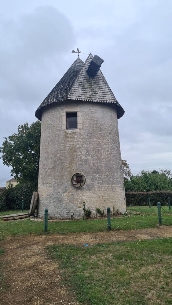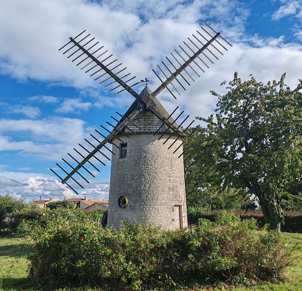 Le moulin du Champ de la Truie s’inscrit dans une longue tradition meunière locale : au milieu du XVIIIe siècle, la carte de Cassini ne recensait pas moins de treize moulins sur la commune, alors que celui-ci n’était pas encore construit. Édifié au début du XIXe siècle, il était à l’origine un petit moulin tour d’environ six mètres de haut, doté d’une seule paire de meules et d’ailes toilées. Réhaussé au milieu du XIXe siècle, il gagna un étage supplémentaire, une seconde paire de meules et des ailes au système Berton, facilitant grandement son exploitation. Situé en Vendée, à proximité du Marais poitevin, ce moulin constitue aujourd’hui un repère patrimonial fort et un témoignage rare de l’ingéniosité artisanale rurale.