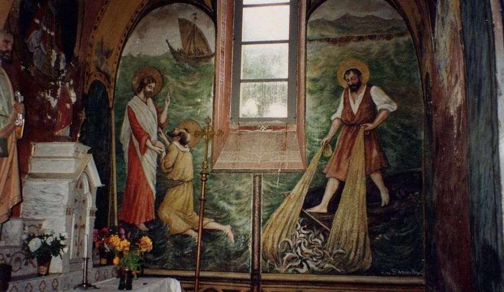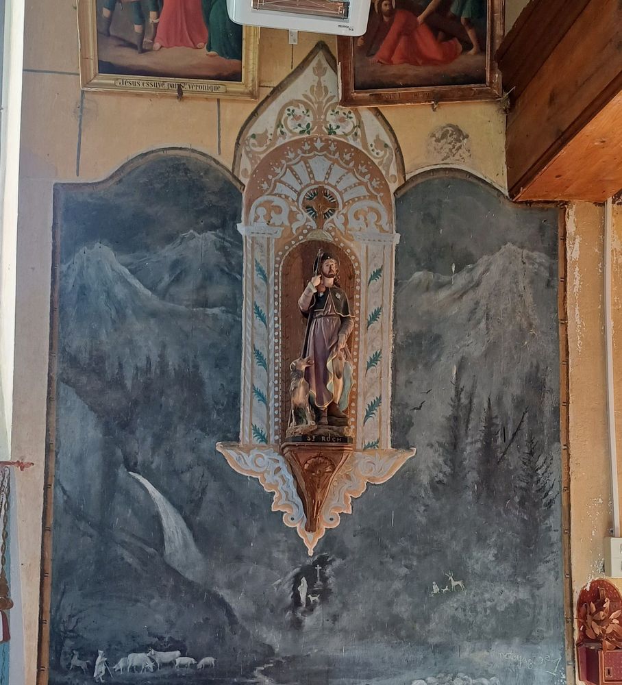 Le mur sud de la nef, les fonts baptismaux et la chapelle Saint-Pierre sont remarquables ; une succession de panneaux illustre avec art et sensibilité quelques épisodes de l’Ancien et du Nouveau Testament ainsi que Saint-Roch, protecteur du bétail. On note aussi une rare représentation de Pie X, pape de 1903 à 1914.
