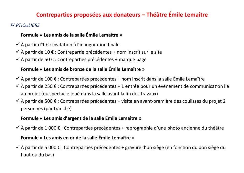 Plusieurs formules de contreparties sont proposées aux donateurs (voir ci-dessous).