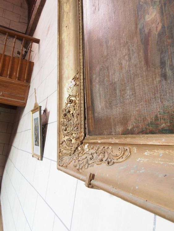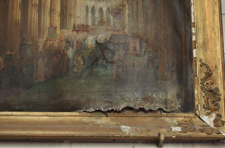 Ce tableau exceptionnel représentant l’abjuration d’Henri IV est installé dans l’église Saint-Médard de Dollon, en Sarthe. Il s'agit d'une œuvre picturale de très grandes dimensions (près de 3 mètres de large avec son cadre d'origine), peinte vers 1850 par un artiste inconnu, témoignant du goût romantique de l'époque pour l’histoire et l’architecture gothique. Aujourd’hui, son état très dégradé – déchirures, lacunes de toile, couche picturale altérée – nécessite une intervention urgente. Le cadre doré, lui aussi fortement abîmé, menace de se désassembler. Grâce à vos dons, la commune souhaite rendre à ce tableau sa lisibilité et sa force évocatrice, et lui permettre de continuer à orner les murs de l’église, pour les générations futures.