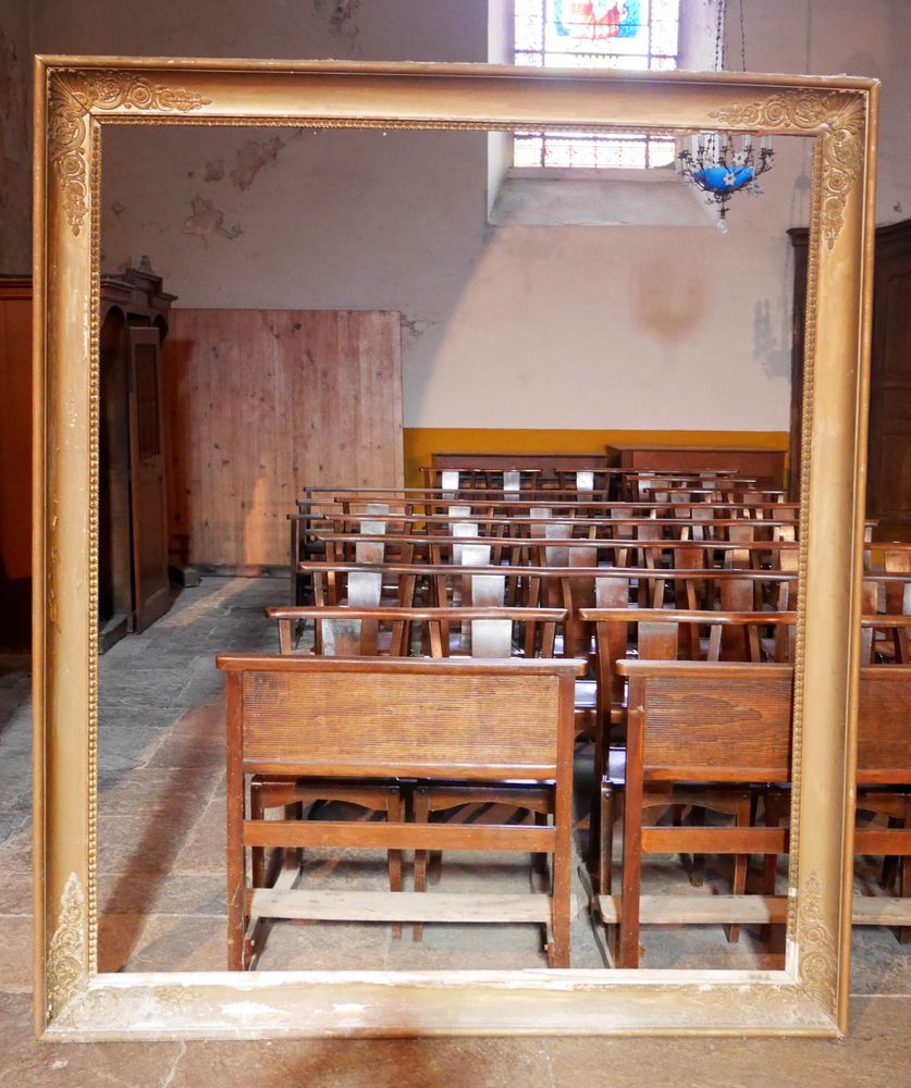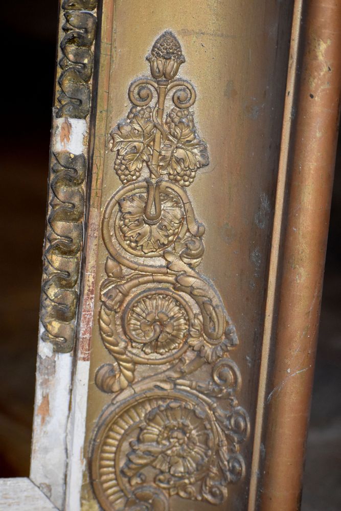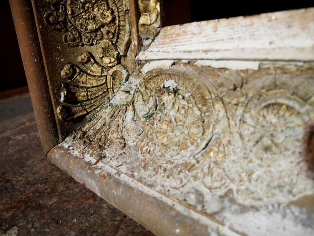 Sur le cadre, beaucoup de salissures sont présentes, la dorure est recouverte de bronzite, la baguette inférieure y compris les ornements sont abimés par l'humidité.