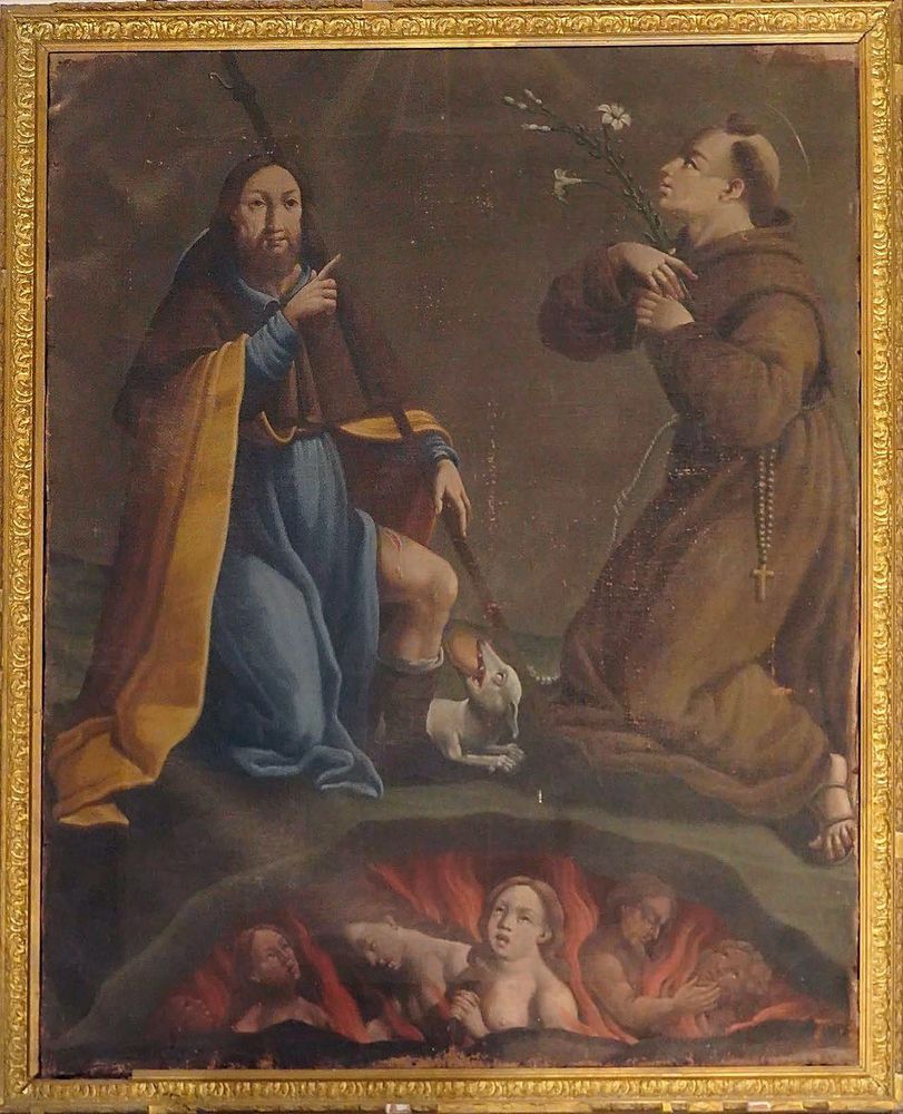 Le premier tableau, représentant Saint Roch et Saint Antoine intercédant pour les Âmes du Purgatoire, est une œuvre du XIXᵉ siècle signée Francesco Carli. Né à Lucques vers 1735, l’artiste s’est établi en Corse après son mariage et a terminé sa vie à San Lorenzu, où il est décédé le 18 octobre 1821 à l’âge de 86 ans.